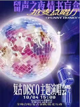 留声之夜,情书盲盒 —— Funny Honey乐队复古Disco主题演唱会|抢麦点唱厅 时间:2025.10.04 周六 15:00 场馆:北京市 | Musicfans Live·爱乐汇艺术空间-常营 票价:120/180 微信订票:18515362586 电话订票:010-66552100,010-66552258